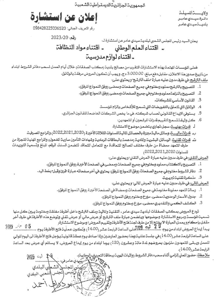 استشارة لـ : اقتناء (العلم الوطني – مواد النظافة – لوازم مدرسية)4 سبتمبر، 20230 36 شاركها فيسبوك X مشاركة عبر البريد طباعة