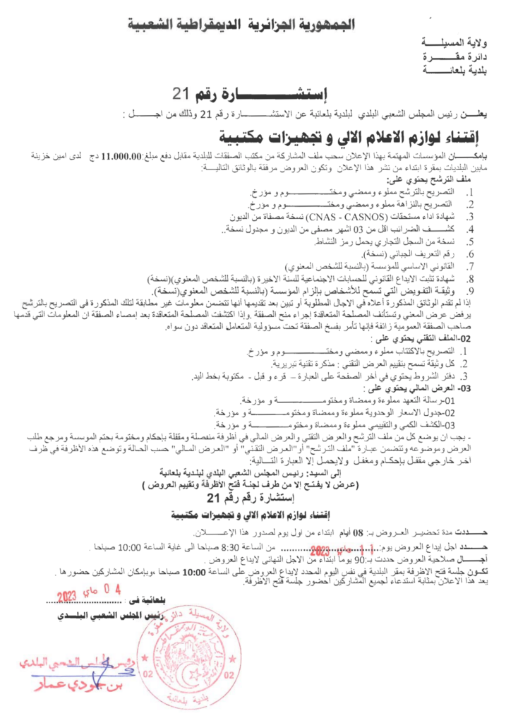 إعلان عن استشارة 2023/21 اقتناء لوازم الإعلام الآلي وتجهيزات مكتبية/ بلدية بلعايبة