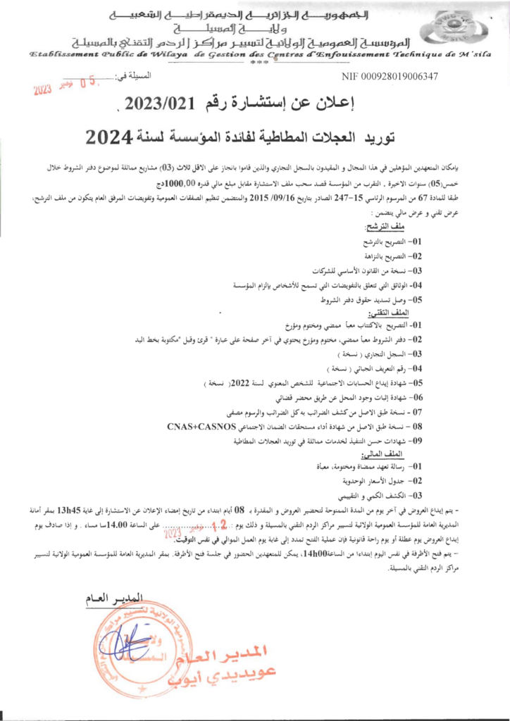 استشارة من أجل: توريد العجلات المطاطية لفائدة المؤسسة لسنة 20246 نوفمبر، 20230 10 شاركها فيسبوك X مشاركة عبر البريد طباعة