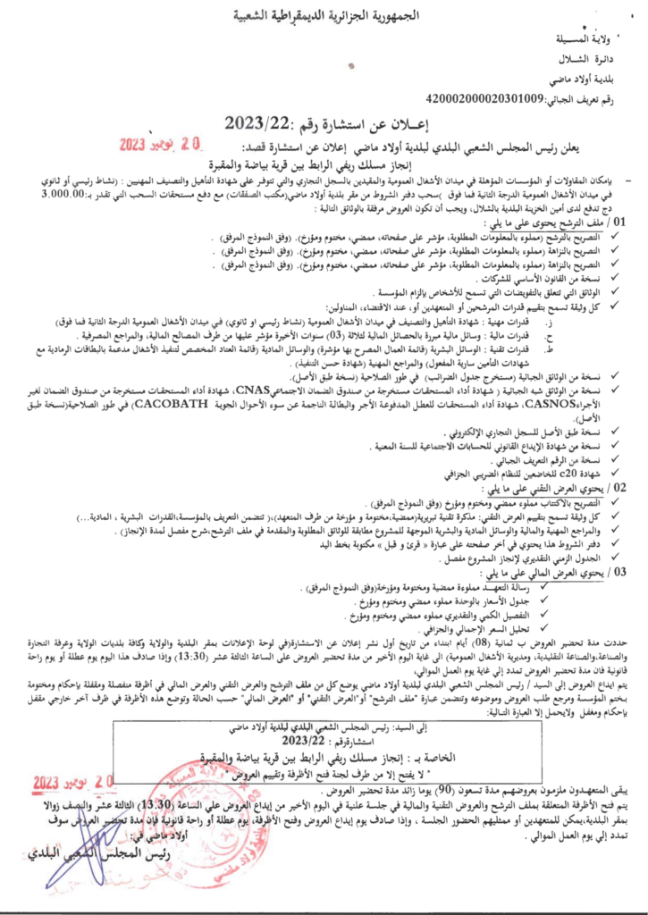 استشارة من أجل: انجاز مسلك ريفي رابط بين بياضة والمقبرة21 نوفمبر، 20230 20 شاركها فيسبوك X مشاركة عبر البريد طباعة
