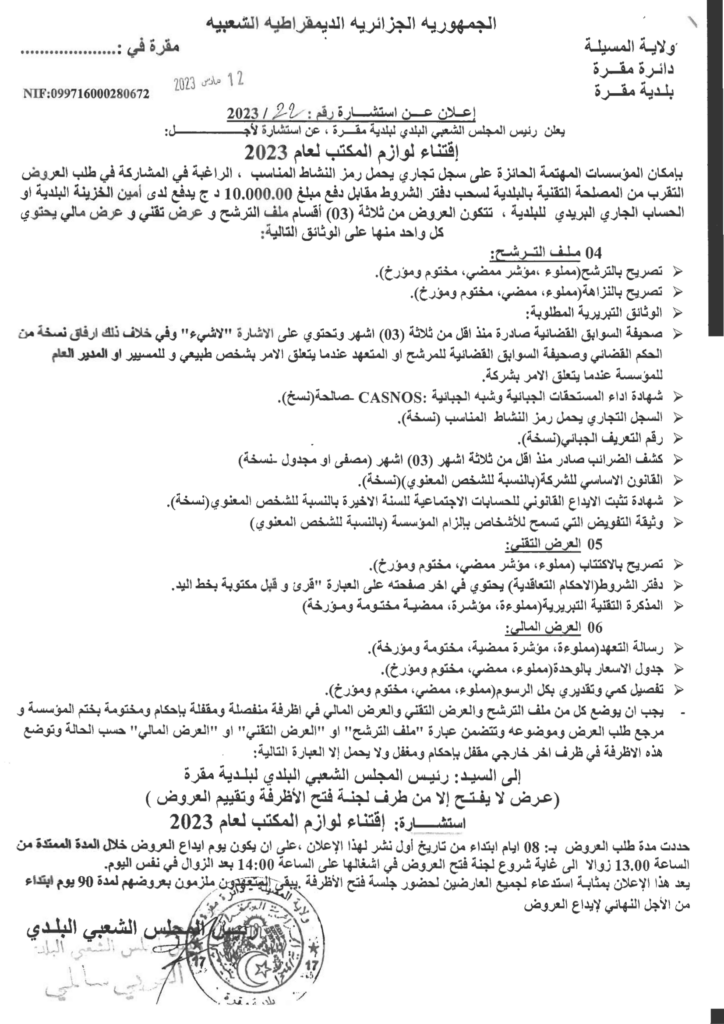 استشارة لأجل: إقتناء لوازم المكتب لعام 2023
