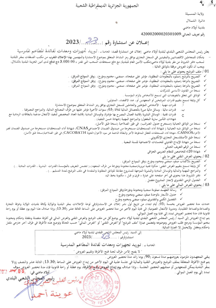 استشارة من أجل: توريد تجهيزات لفائدة المطاعم المدرسية10 ديسمبر، 20230 26 شاركها فيسبوك X مشاركة عبر البريد طباعة