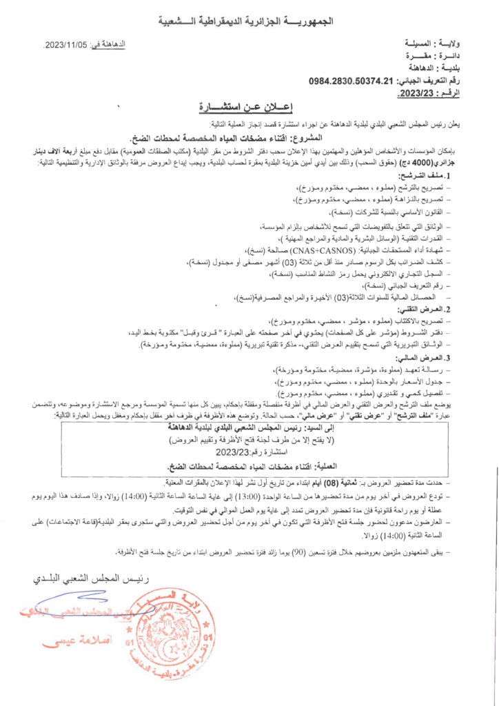 استشارة من أجل: اقتناء مضخات المياه المخصصة لمحطات الضخ5 نوفمبر، 20230 6 شاركها فيسبوك X مشاركة عبر البريد طباعة
