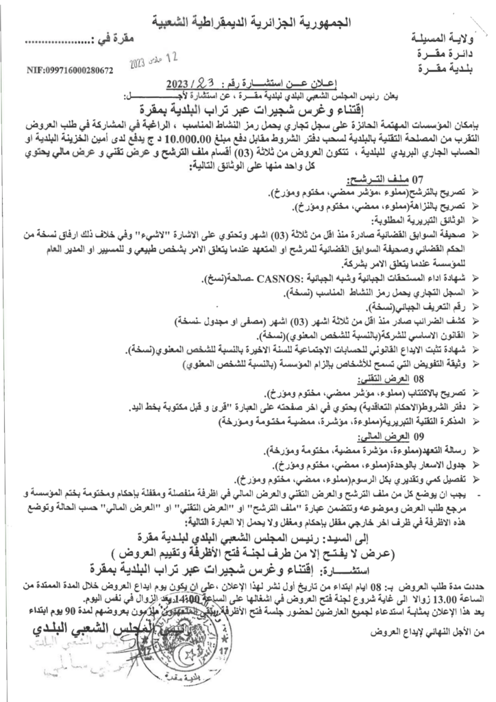 استشارة لأجل: لإقتناء وغرس شجيرات عبر تراب البلدية12 مارس، 20230 3 شاركها فيسبوك X مشاركة عبر البريد طباعة