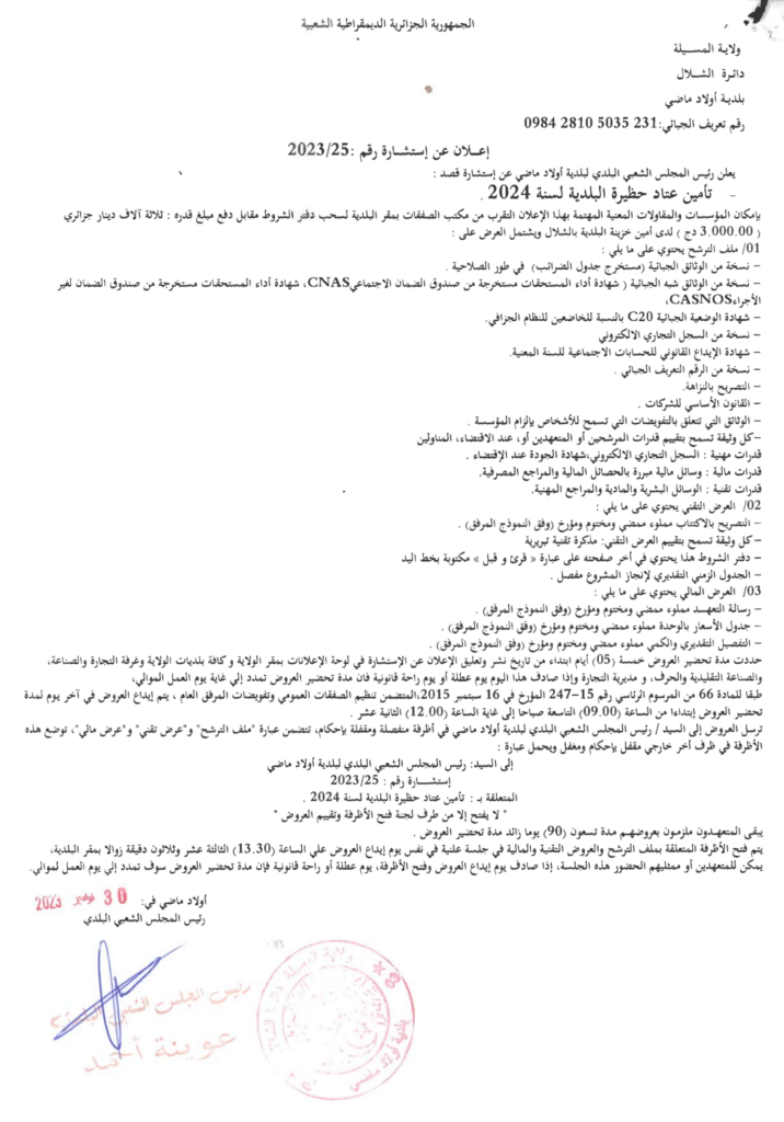 استشارة من أجل: تأمين عتاد حظيرة البلدية لسنة 202410 ديسمبر، 20230 9 شاركها فيسبوك X مشاركة عبر البريد طباعة