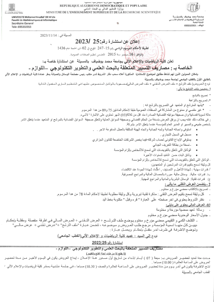 استشارة من أجل: مصاريف التسيير المتعلقة بالبحث العلمي والتطوير التكنولوجي – اللوازم –19 نوفمبر، 20230 4 شاركها فيسبوك X مشاركة عبر البريد طباعة