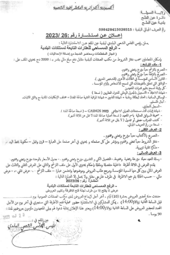 استشارة من أجل: الرفع الممساحي للعقارات التابعة لممتلكات البلدية4 سبتمبر، 20230 15 شاركها فيسبوك X مشاركة عبر البريد طباعة