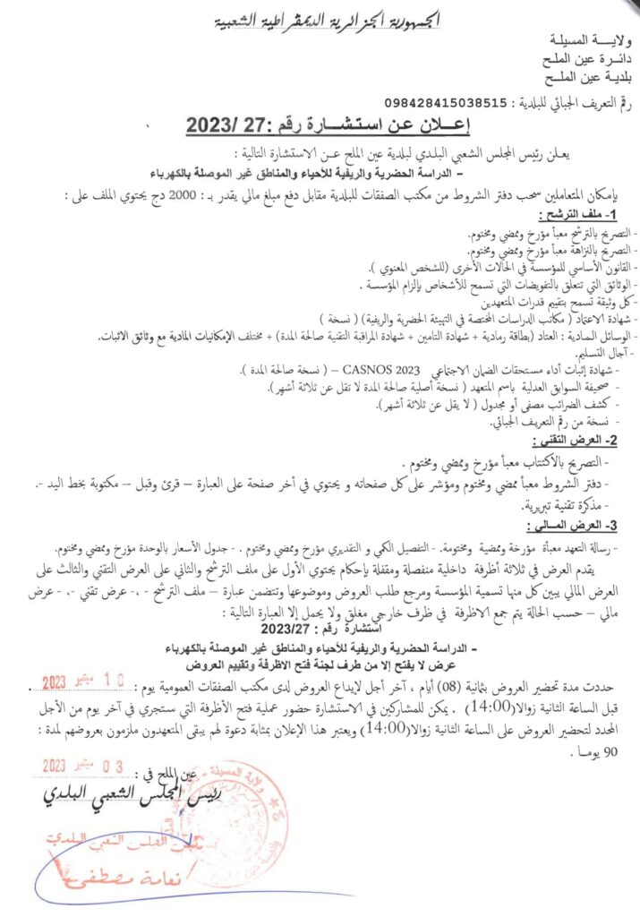 استشارة: الدراسة الحضرية والريفية للأحياء والمناطق غير الموصلة بالكهرباء ببلدية عين الملح5 سبتمبر، 20230 39 شاركها فيسبوك X مشاركة عبر البريد طباعة