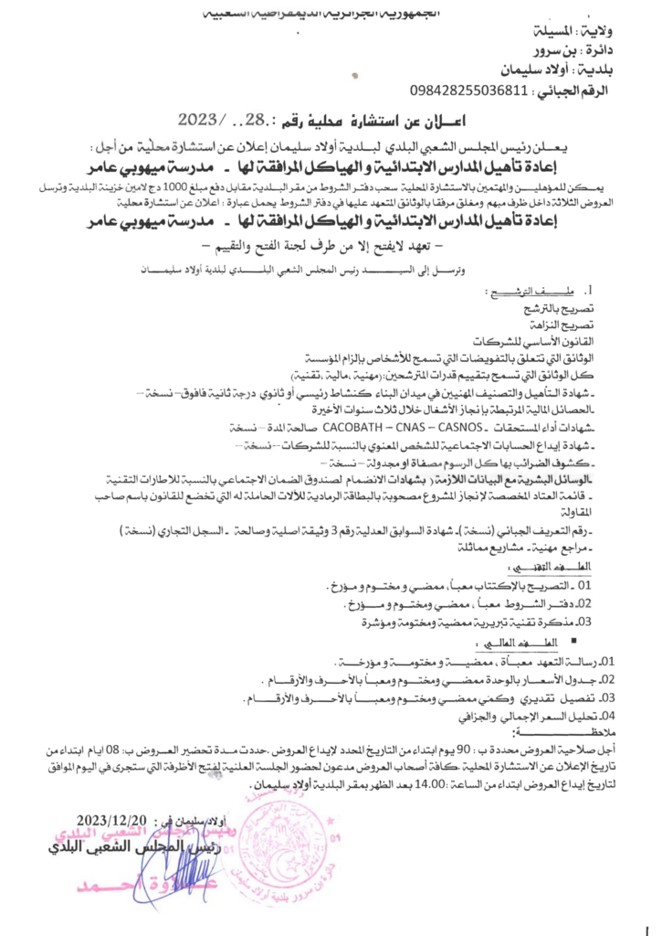 استشارة من أجل: إعادة تأهيل المدارس الابتدائية والهياكل المرافقة لها -مدرسة ميهوبي عامر24 ديسمبر، 20230 34 شاركها فيسبوك X مشاركة عبر البريد طباعة