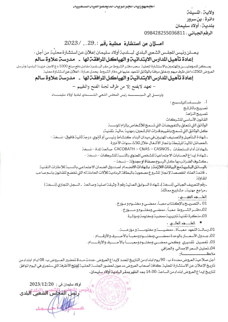 استشارة من أجل: إعادة تأهيل المدارس الابتدائية والهياكل المرافقة لها -مدرسة علاوة سالم24 ديسمبر، 20230 46 شاركها فيسبوك X مشاركة عبر البريد طباعة