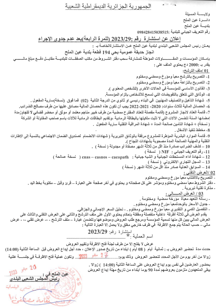 استشارة خاصة بـ : انجاز حديقة عمومية بحي 194 قطعة24 سبتمبر، 20230 17 شاركها فيسبوك X مشاركة عبر البريد طباعة