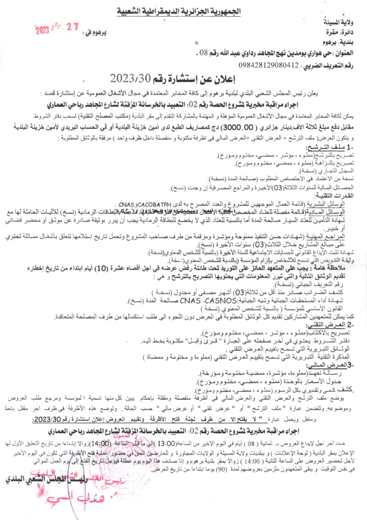 استشارة من أجل: اجراء مراقبة مخبرية لمشروع الحصة 02 : التعبيد بالخرسانة المزفتة لشارع المجاهد رباحي العماري2 أكتوبر، 20230 3 شاركها فيسبوك X مشاركة عبر البريد طباعة