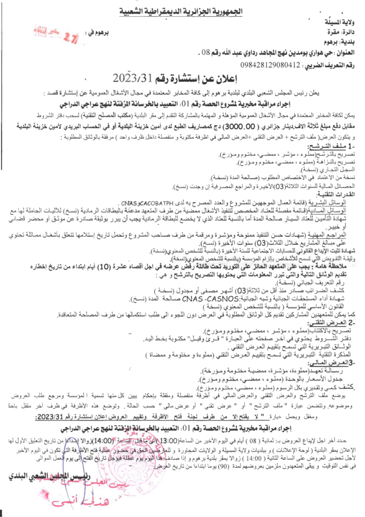 استشارة من أجل: اجراء مراقبة مخبرية لمشروع الحصة 1 : التعبيد بالخرسانة المزفتة لنهج عراجي الدراجي2 أكتوبر، 20230 2 شاركها فيسبوك X مشاركة عبر البريد طباعة