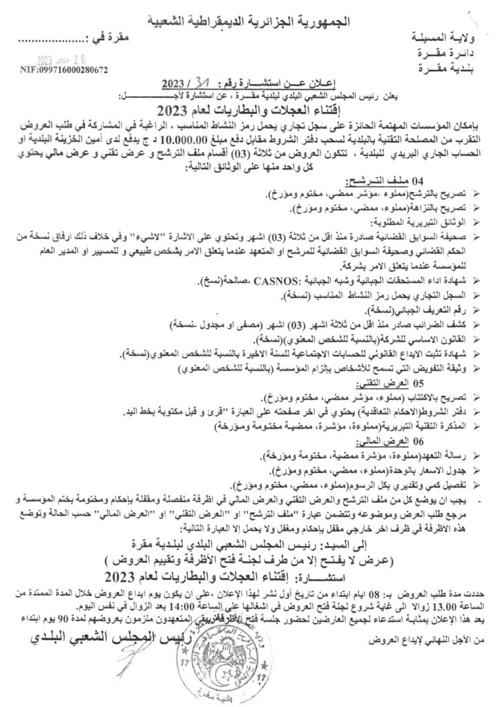 استشارة لأجل: اقتناء العجلات والبطاريات لعام 202326 مارس، 20230 13 شاركها فيسبوك X مشاركة عبر البريد طباعة
