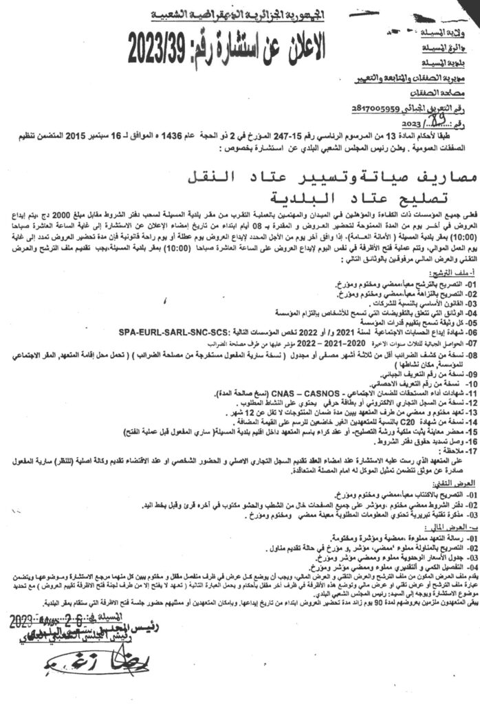 استشارة بخصوص: مصاريف صيانة وتسيير عتاد النقل – تصليح عتاد البلدية1 أغسطس، 20230 23 شاركها فيسبوك X مشاركة عبر البريد طباعة