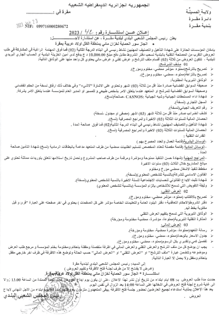 استشارة لأجل: انجاز سور الحماية لخزان مائي بمنطقة الظل أولاد عريبة بمقرة25 أبريل، 20230 26 شاركها فيسبوك X مشاركة عبر البريد طباعة