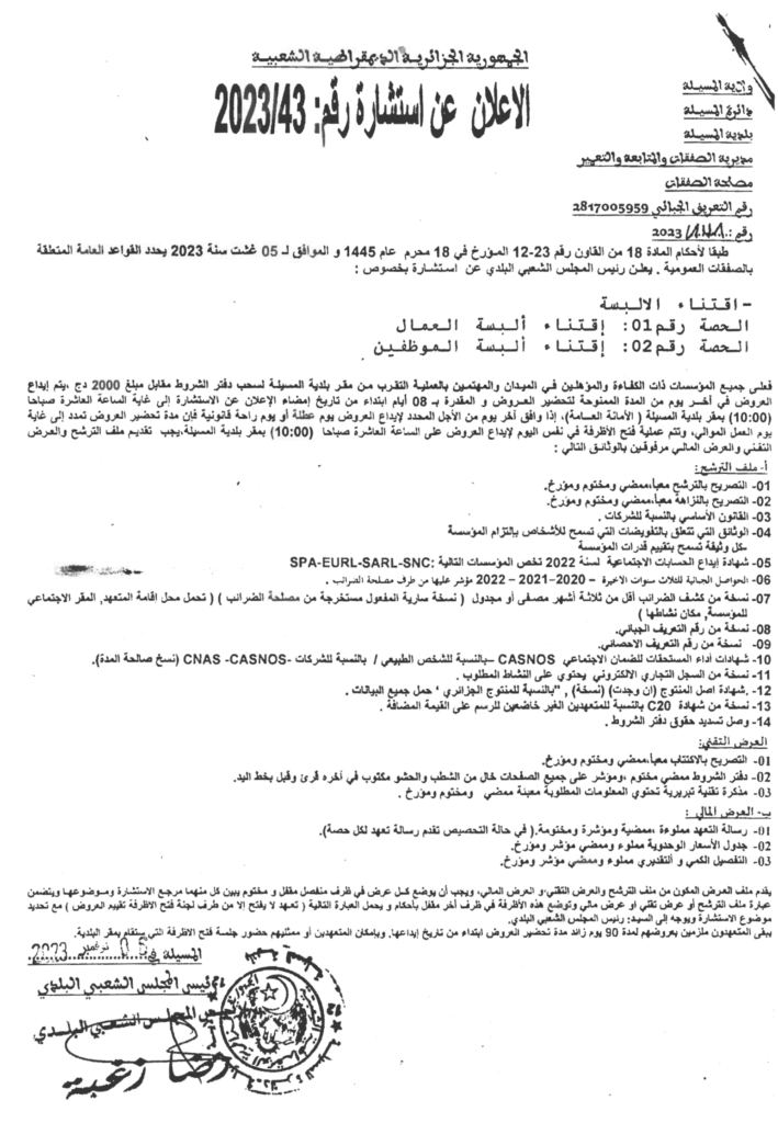 استشارة من أجل: اقتناء ألبسة العمال والموظفين12 نوفمبر، 20230 8 شاركها فيسبوك X مشاركة عبر البريد طباعة
