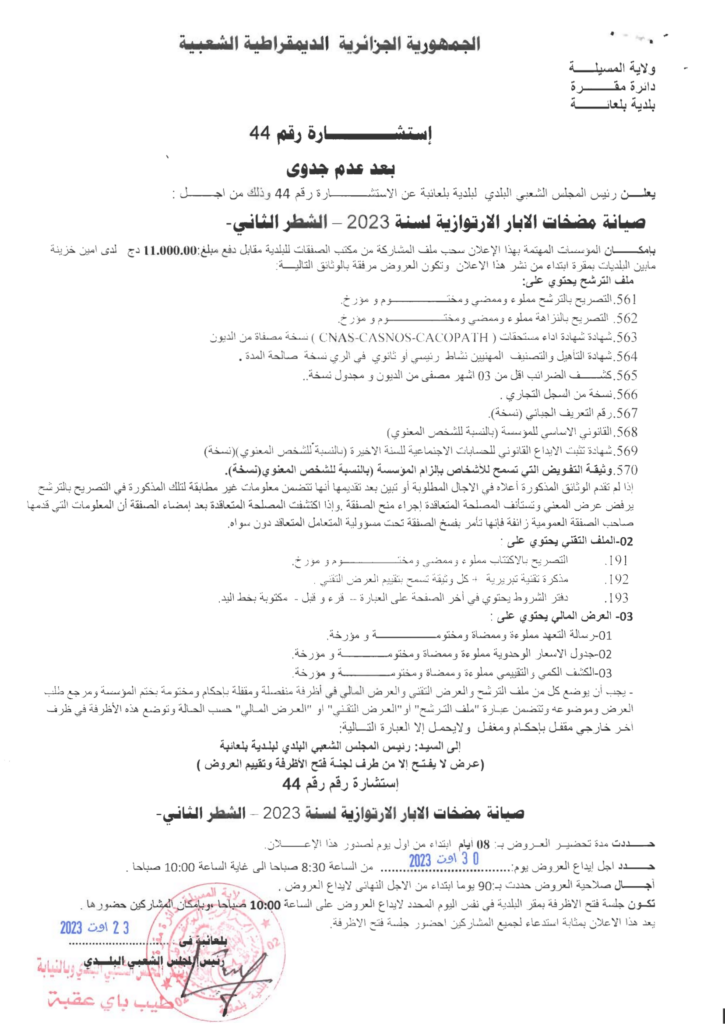 استشارة من أجل صيانة مضخات الآبار الارتوازية لسنة 2023 الشطر 2 لبلدية بلعايبة27 أغسطس، 20230 14 شاركها فيسبوك X مشاركة عبر البريد طباعة