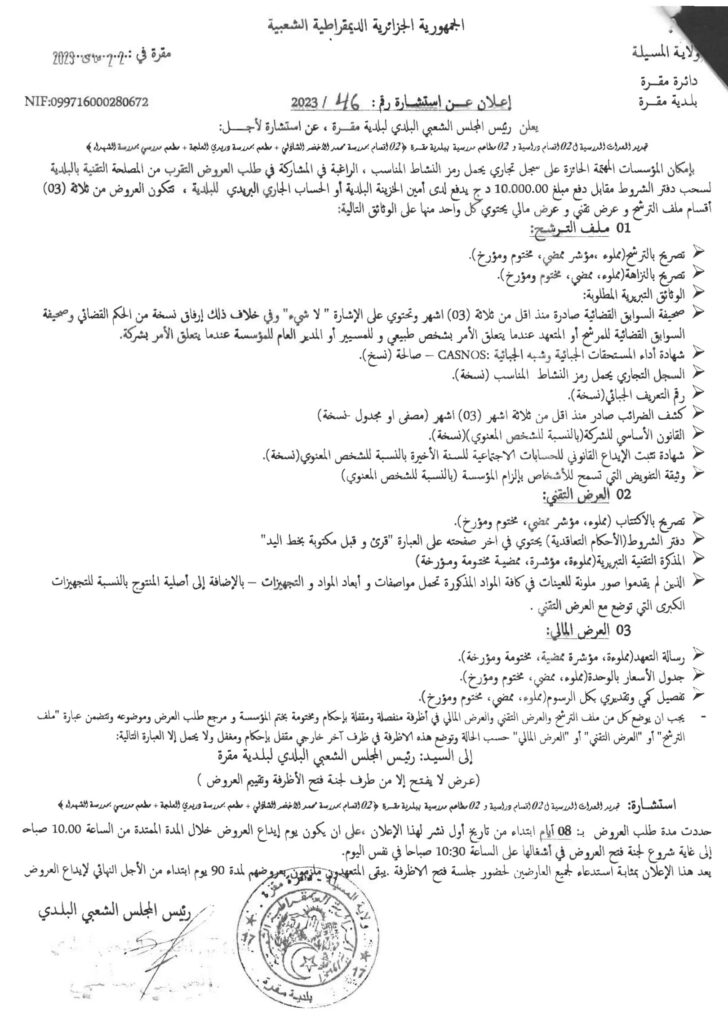 استشارة لأجل: تجديد معدات المدرسية 02 أقسام دراسية و02 مطاعم مدرسية ببلدية مقرة23 مايو، 20230 61 شاركها فيسبوك X مشاركة عبر البريد طباعة