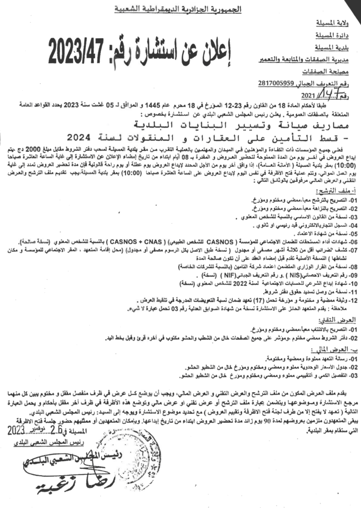 استشارة بخصوص: مصاريف صيانة وتسيير البنايات البلدية (قسط التأمين على العقارات والمنقولات لسنة 2024)29 نوفمبر، 20230 22 شاركها فيسبوك X مشاركة عبر البريد طباعة