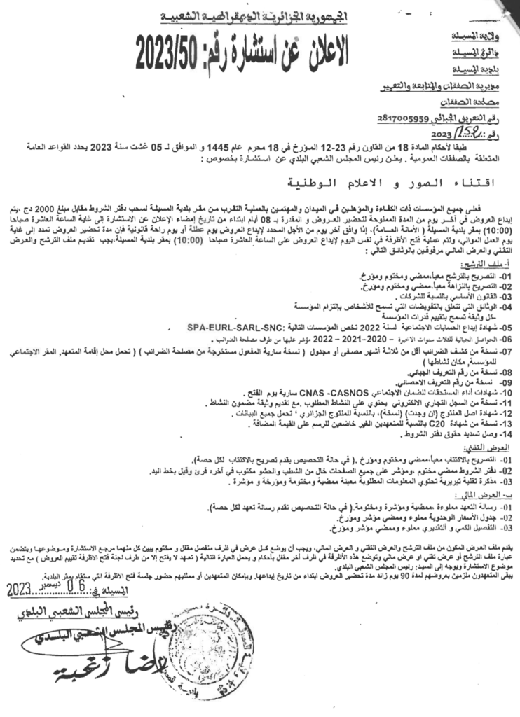 استشارة من أجل: اقتناء الصور والاعلام الوطنية10 ديسمبر، 20230 19 شاركها فيسبوك X مشاركة عبر البريد طباعة