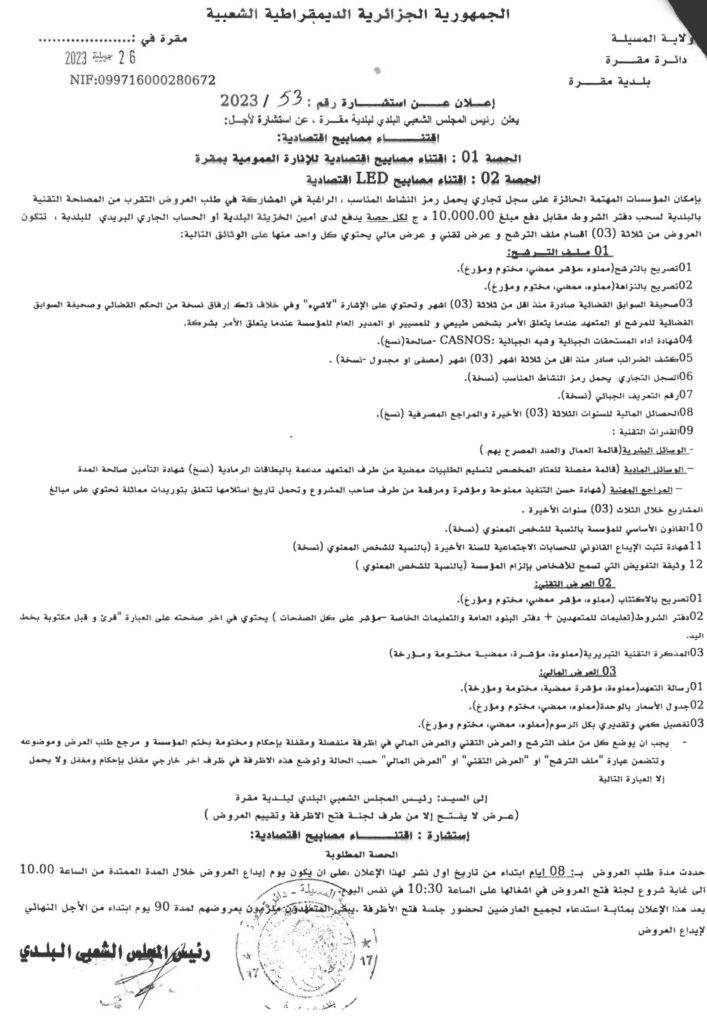 استشارة لأجل: اقتناء صابيح اقتصادية: الحصة 01: اقتناء مصابيح للإنارة العمومية بمقرة، الحصة 02: اقتناء مصابيح LED اقتصادية1 أغسطس، 20230 48 شاركها فيسبوك X مشاركة عبر البريد طباعة
