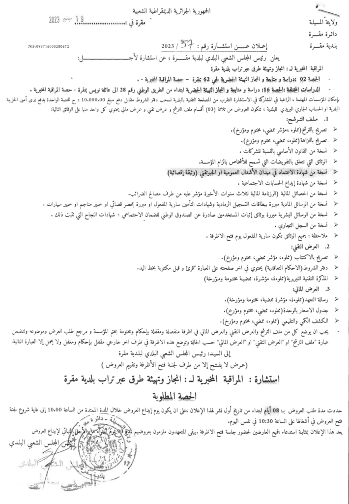 استشارة من أجل: المراقبة المخبرية لانجاز وتهيئة طرق عبر تراب بلدية مقرة24 سبتمبر، 20230 20 شاركها فيسبوك X مشاركة عبر البريد طباعة