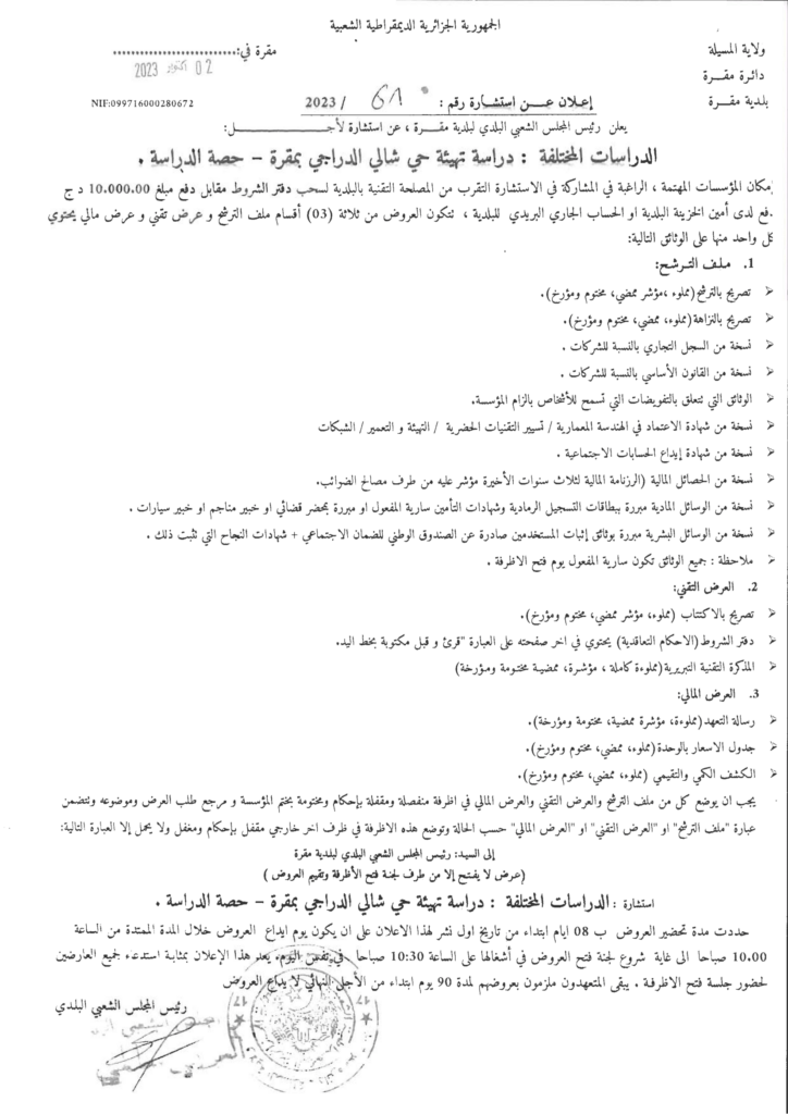 استشارة لأجل: الدراسات المختلفة: دراسة تهيئة حي شالي الدراجي بمقرة -حصة الدراسة-10 أكتوبر، 20230 39 شاركها فيسبوك X مشاركة عبر البريد طباعة