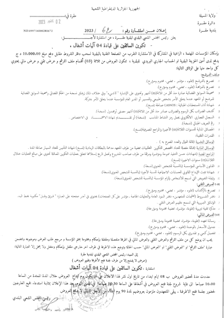 استشارة من أجل: تكوين السائقين على قيادة 04 آليات أنشغال4 أكتوبر، 20230 7 شاركها فيسبوك X مشاركة عبر البريد طباعة