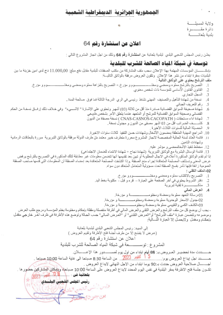 استشارة من أجل: توسعة في شبكة المياه الصالحة للشرب للبلدية9 أكتوبر، 20230 21 شاركها فيسبوك X مشاركة عبر البريد طباعة