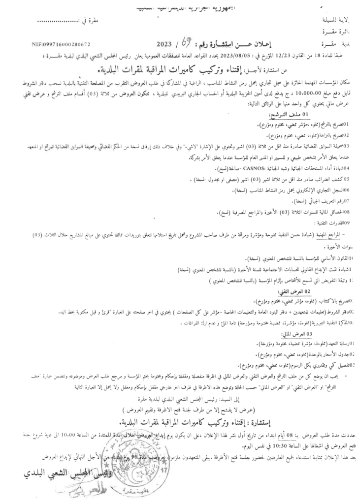 استشارة لأجل: اقتناء وتركيب كاميرات المراقبة لمقرات البلدية30 نوفمبر، 20230 41 شاركها فيسبوك X مشاركة عبر البريد طباعة