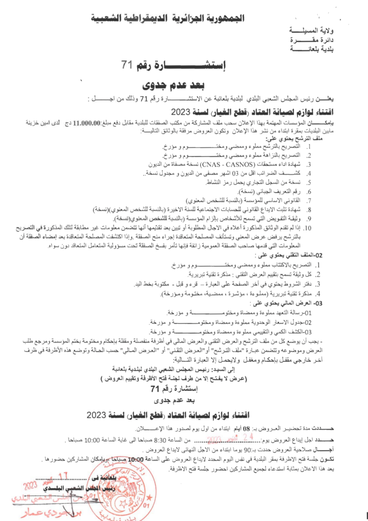 استشارة من أجل: اقتناء لوازم لصيانة العتاد قطع الغيار لسنة 202318 أكتوبر، 20230 6 شاركها فيسبوك X مشاركة عبر البريد طباعة