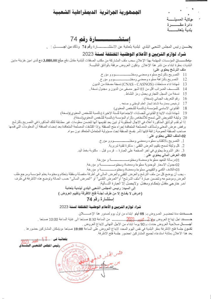 استشارة من أجل: شراء لوازم التزيين والأعلام الوطنية المختلفة لسنة 202318 أكتوبر، 20230 17 شاركها فيسبوك X مشاركة عبر البريد طباعة