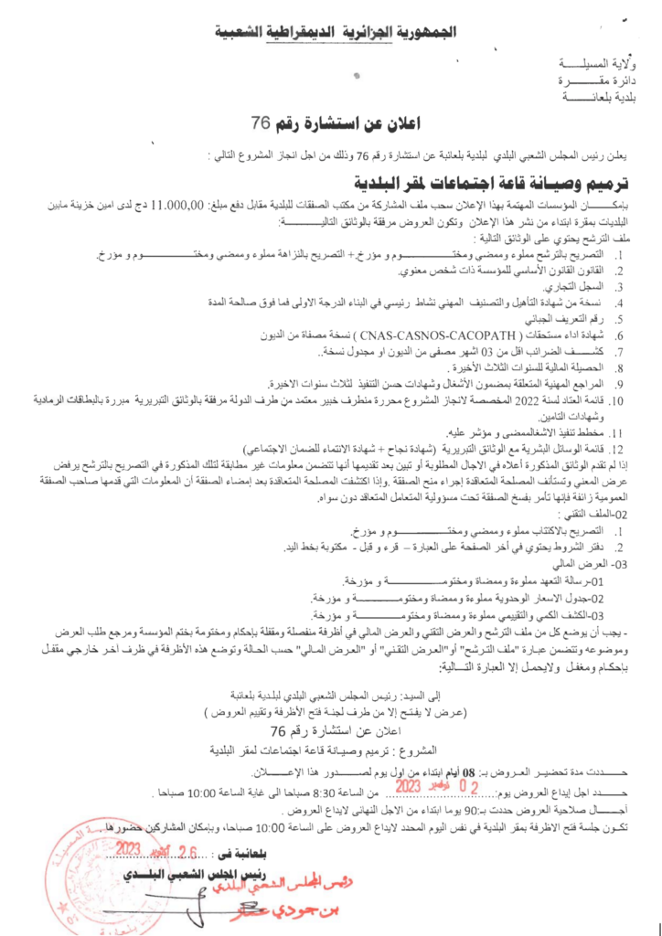 استشارة من أجل انجاز المشروع التالي: ترميم وصيانة قاعة اجتماعات لمقر البلدية29 أكتوبر، 20230 24 شاركها فيسبوك X مشاركة عبر البريد طباعة
