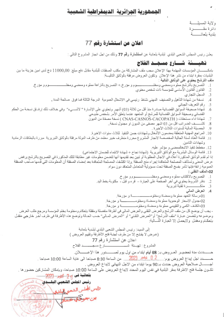استشارة من أجل انجاز المشروع التالي: تهيئة شارع مسجد الفلاح29 أكتوبر، 20230 22 شاركها فيسبوك X مشاركة عبر البريد طباعة