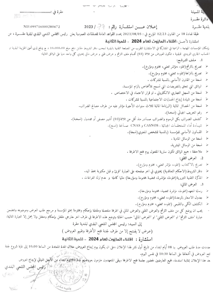 استشارة من أجل: اقتناء المازوت لعام 2024 -للمرة الثانية24 ديسمبر، 20230 25 شاركها فيسبوك X مشاركة عبر البريد طباعة