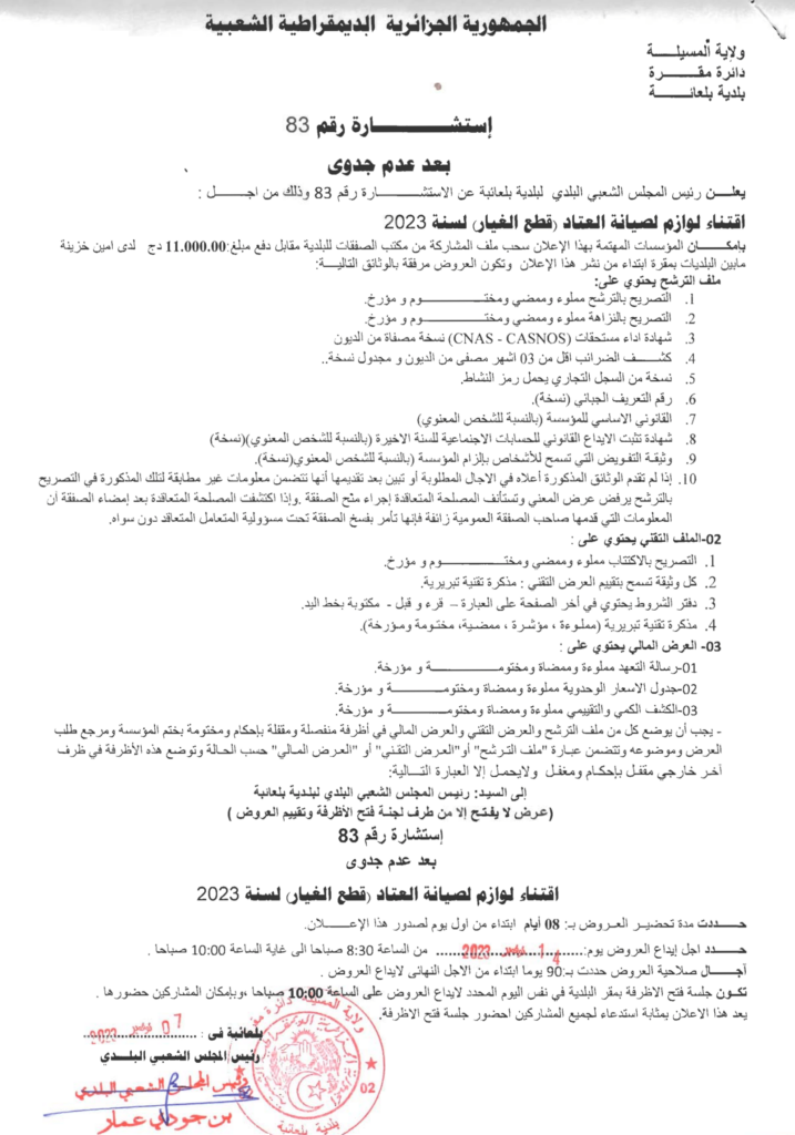 استشارة من أجل: اقتناء لوازم لصيانة العتاد (قطع الغيار) لسنة 20238 نوفمبر، 20230 23 شاركها فيسبوك X مشاركة عبر البريد طباعة