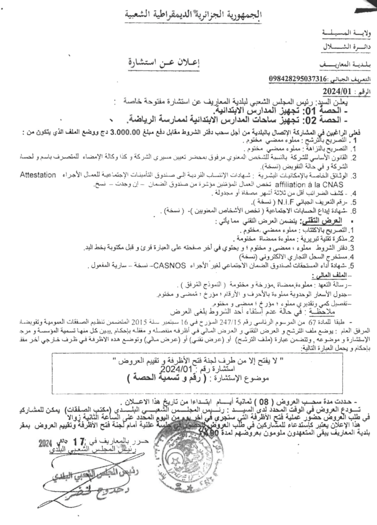 استشارة مفتوحة خاصة بـ تجهيز المدارس الابتدائية – تجهيز ساحات المدارس الابتدائية لممارسة الرياضة22 يناير، 20240 74 شاركها فيسبوك X مشاركة عبر البريد طباعة