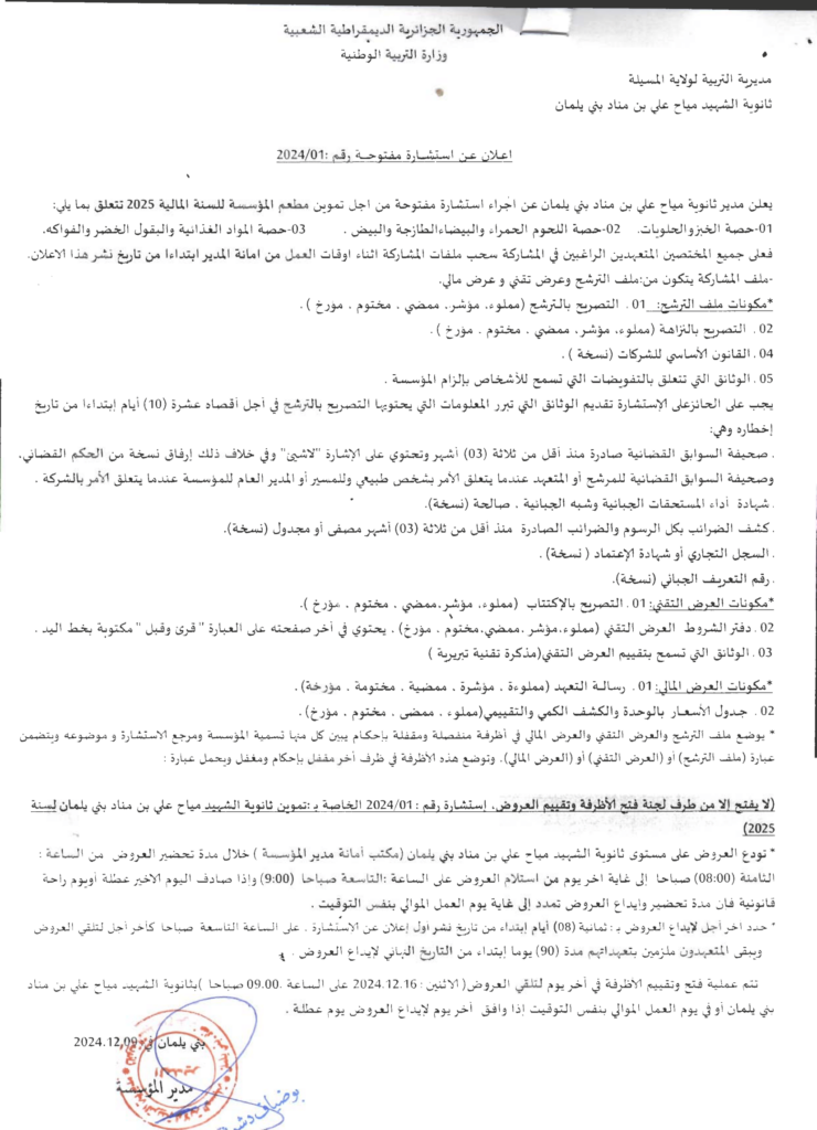 استشارة من أجل: تموين مطعم المؤسسة للسنة المالية 202515 ديسمبر، 20240 14 شاركها فيسبوك X مشاركة عبر البريد طباعة