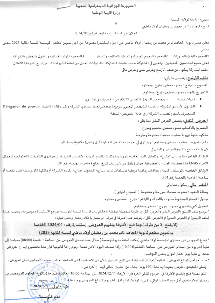 استشارة من أجل: تموين مطعم المؤسسة للسنة المالية 202515 ديسمبر، 20240 37 شاركها فيسبوك X مشاركة عبر البريد طباعة