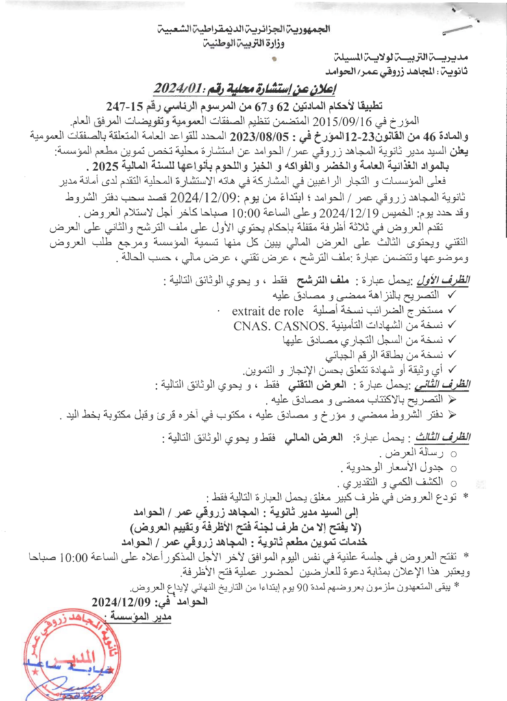 إعلان عن استشارة 2024/01 ثانوية المجاهد زروقي عمر -الحوامد-