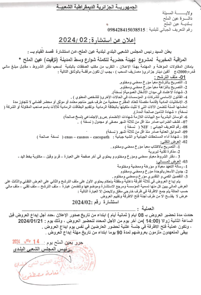 استشارة قصد القيام بـ : المراقبة المخبرية لمشروع تهيئة حضرية لتكملة شوارع المدينة (تزفيت) عين الملح17 يناير، 20240 23 شاركها فيسبوك X مشاركة عبر البريد طباعة