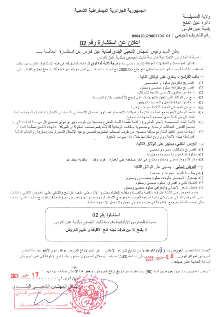 استشارة خاصة بـ : صيانة المدارس الابتدائية مدرسة ثابت الجمعي ببلدية عين فارس17 مارس، 20240 60 شاركها فيسبوك X مشاركة عبر البريد طباعة
