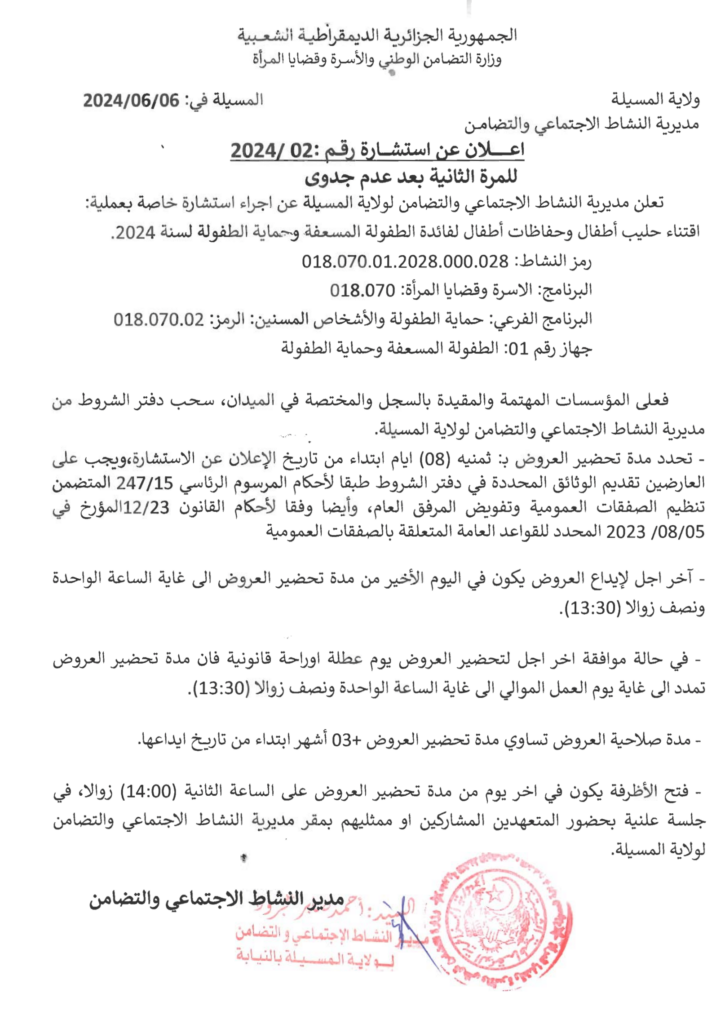 استشارة من أجل: اقتناء حليب أطفال وحفاظات لفائدة الطفولة المسعفة وحماية الطفولة لسنة 20249 يونيو، 20240 35 شاركها فيسبوك X مشاركة عبر البريد طباعة