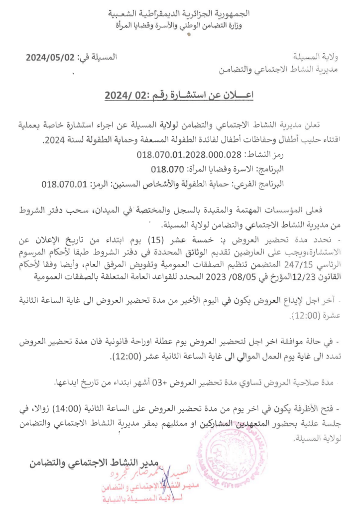 استشارة من أجل: اقتناء حليب أطفال وحفاظات أطفال لفائدة الطفولة المسعفة وحماية الطفولة لسنة 20242 مايو، 20240 0 شاركها فيسبوك X مشاركة عبر البريد طباعة