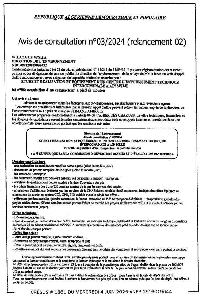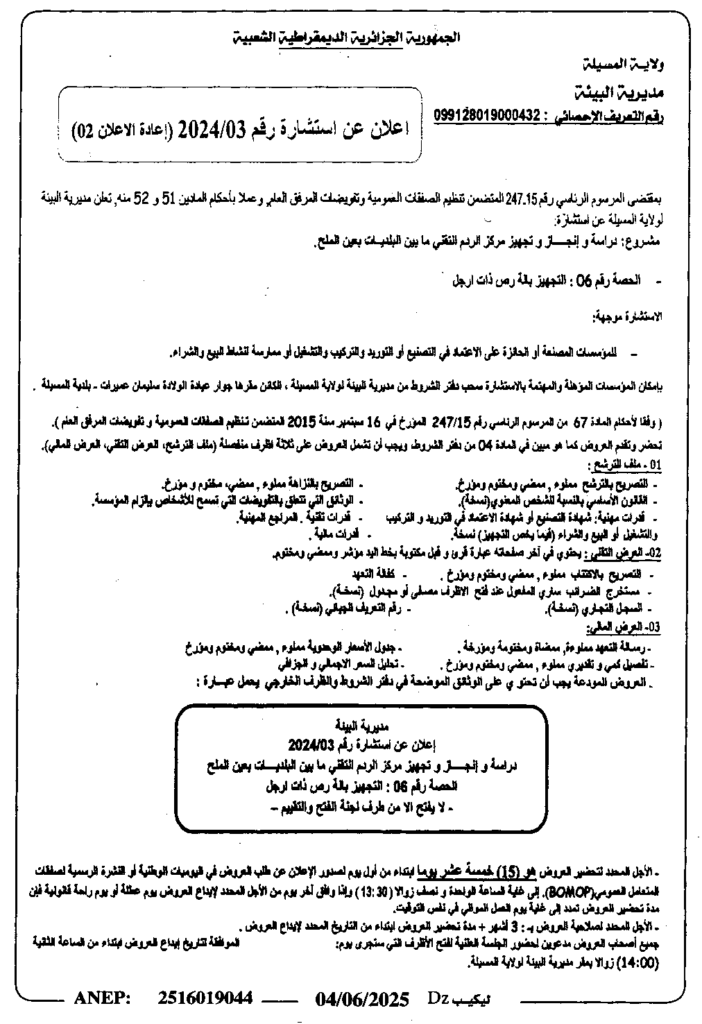 دراسة وانجاز وتجهيز مركز الردم التقني ما بين البلديات بعين الملح4 يونيو، 20250 17 شاركها فيسبوك X مشاركة عبر البريد طباعة