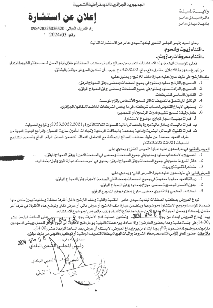 استشارة من أجل: اقتناء زيوت وشحوم-اقتناء محروقات (مازوت)13 مايو، 20240 41 شاركها فيسبوك X مشاركة عبر البريد طباعة