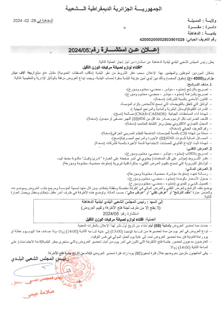 استشارة من أجل: اقتناء لوازم لصيانة مركبات الوزن الثقيل29 فبراير، 20240 2 شاركها فيسبوك X مشاركة عبر البريد طباعة