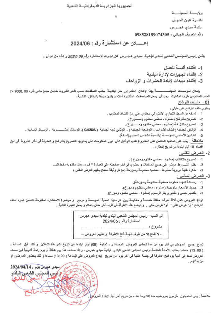 استشارة من أجل: اقتناء (ألبسة للعمال-تجهيزات لادارة البلدية-مبيدات لابادة الحشرات والزواحف)17 أبريل، 20240 26 شاركها فيسبوك X مشاركة عبر البريد طباعة