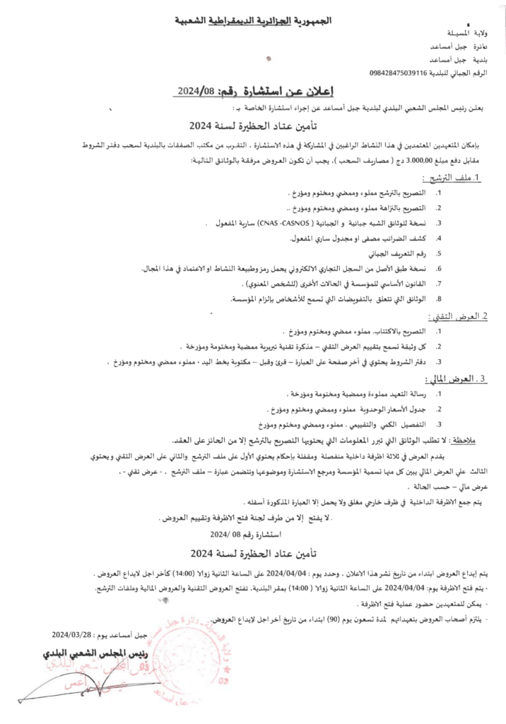 استشارة من أجل: تأمين عتاد الحظيرة لسنة 20242 أبريل، 20240 26 شاركها فيسبوك X مشاركة عبر البريد طباعة